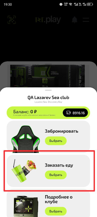 - На странице клуба найдите и нажмите кнопку «Заказать еду»