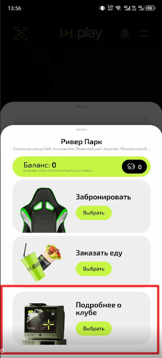 Показать, как найти подробную информацию о клубе в приложении IZI: адрес, время работы, меню бара и как быстро начать игру в выбранном клубе.