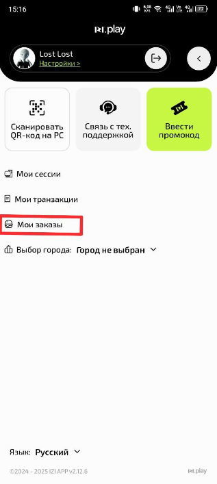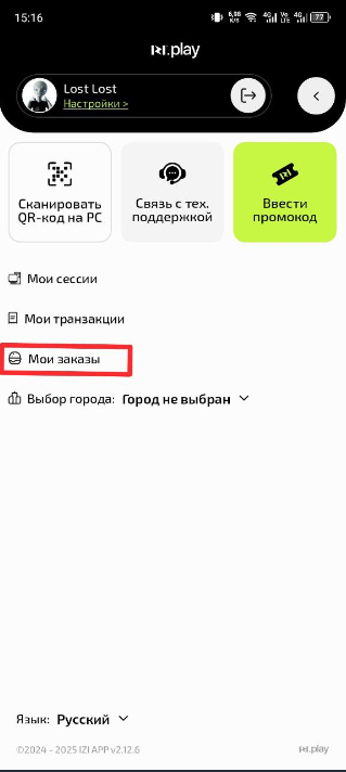 - В меню профиля найдите и нажмите на пункт "Мои заказы"